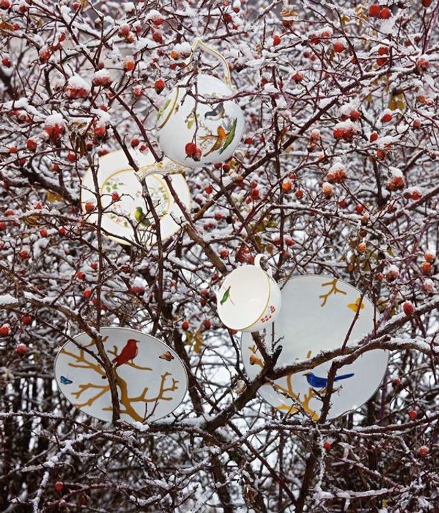 Die Vögel naschen Winterbeeren vom Baum, wir von Tellern mit Vogelmotiven (von oben): Teekanne »Rothschild Oiseaux«, Herend; Frühstücksteller und Kaffeetasse »Birds«, Dibbern; Dessertteller und Speiseteller »Aux Oiseaux«, Bernardaud (gesehen bei Atelier Pilati).