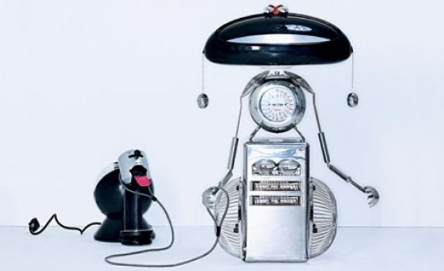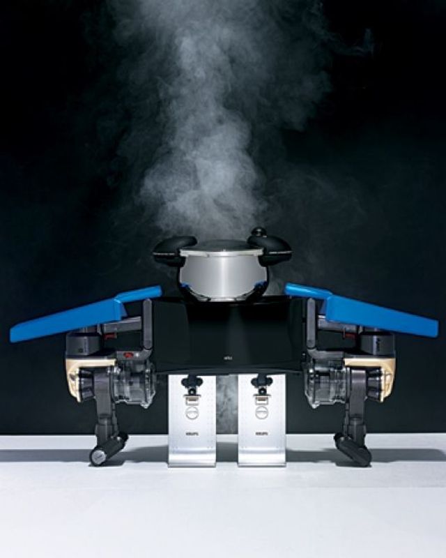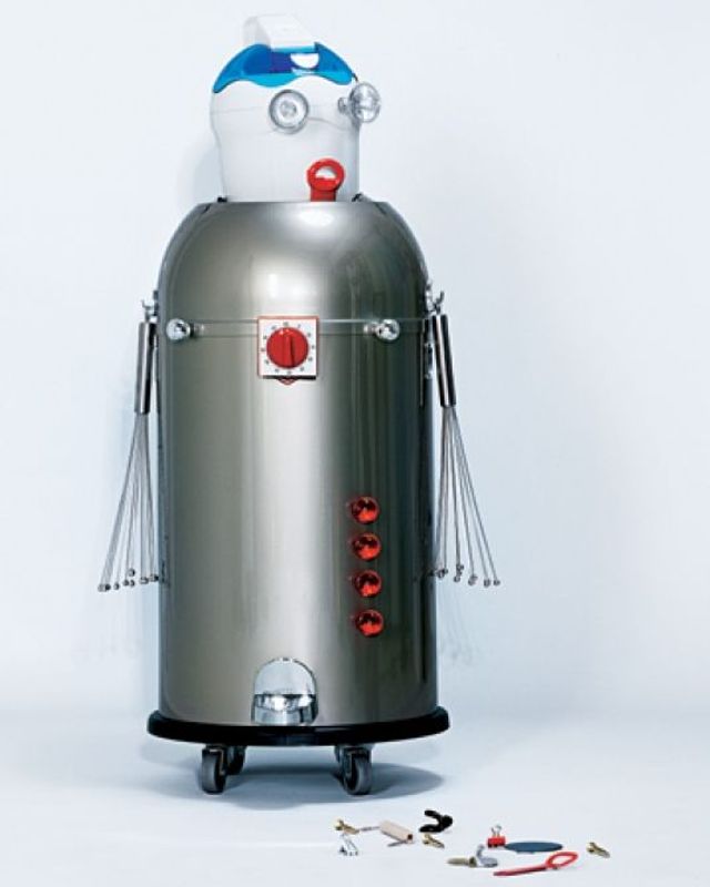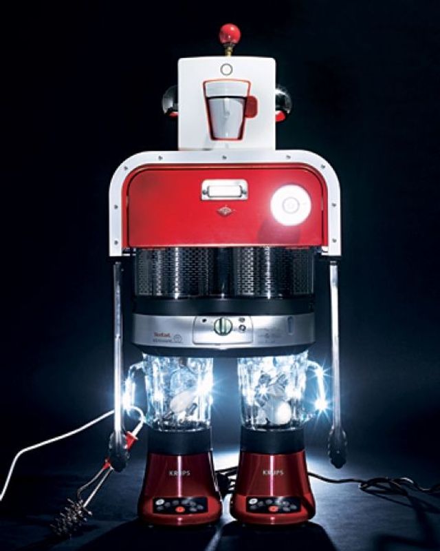 Kopf: Schnellkochtopf »Mami« von Stefano Giovannoni für Alessi; Körper: Langschlitztoaster »Multitoast« von Braun; Arme: Akkusauger »Animalpro« von Dyson; Flügel: Schneidebretter »Chop«; Beine: Dosenöffner »Open Control« von Krups.