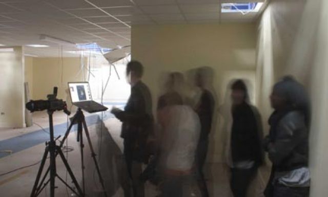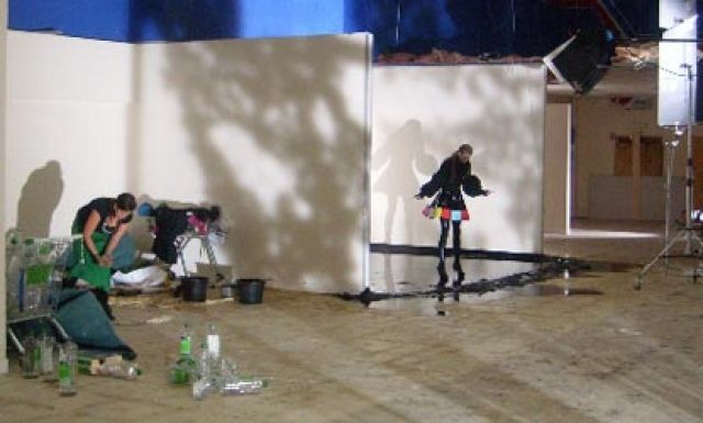 Gewünschte Distanz: "Das erkennt man hier kaum, aber das Model steht dort rechts zwischen der Leiter und dem Stativ. Wir stehen am anderen Ende, links. Die Entfernung war nötig, um Tiefe in das Bild zu kriegen, da sieht man, wie groß die Halle ist. Die gelben Lampen und die Jacken sind übrigens eine installation der Hausbesetzer."