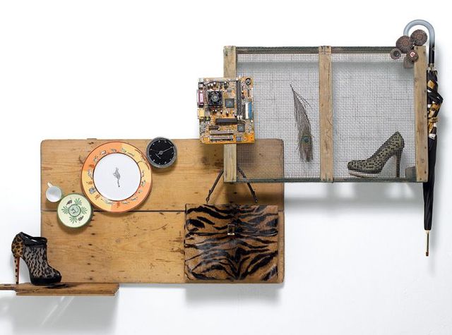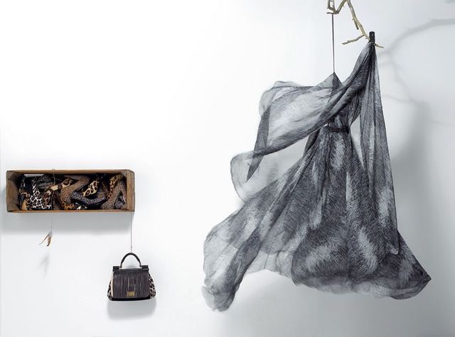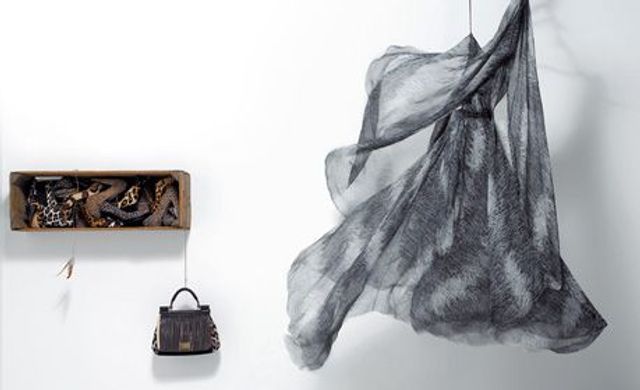 Pumps mit Leopardenspitze, von Louboutin (1), Safari-Geschirr von Hermès (2), getigerte Tasche von Roger Vivier (3), High Heel mit Schneeleopardenmuster, von Etro (4), Regenschirm von Gianfranco Ferré (5).