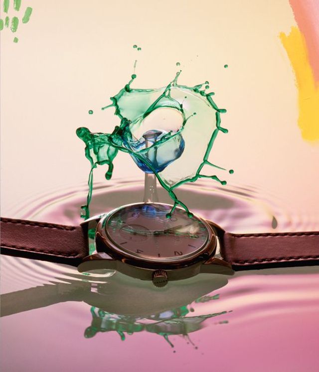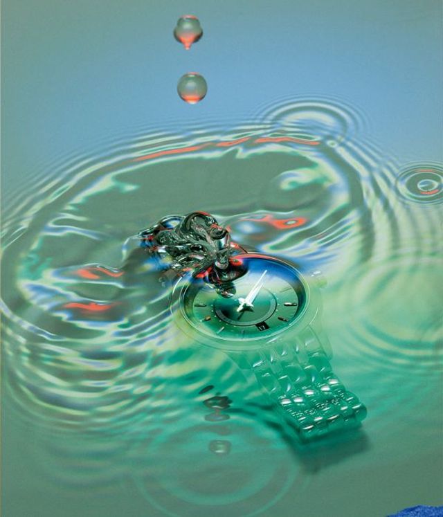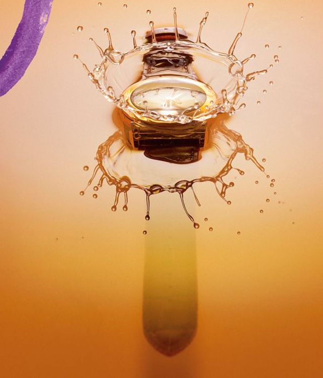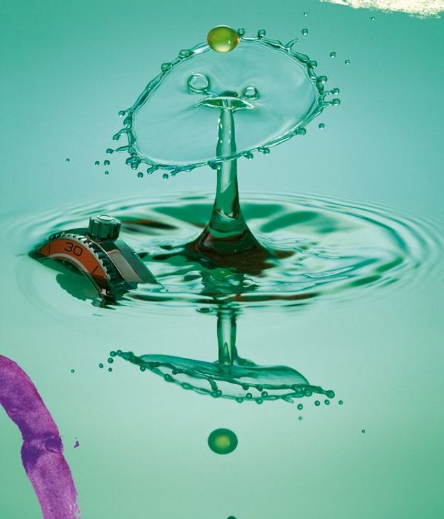 Für ein Foto wie dieses braucht es nicht nur eine wasserdichte Uhr und hochentwickelte Computersoftware, sondern auch große Erfahrung in Tropfenfotografie, um im richtigen Moment auf den Auslöser zu drücken. Herrenuhr von Rolex, Modell »Oyster Perpetual Submariner Date«, wasserdicht bis 30 bar.