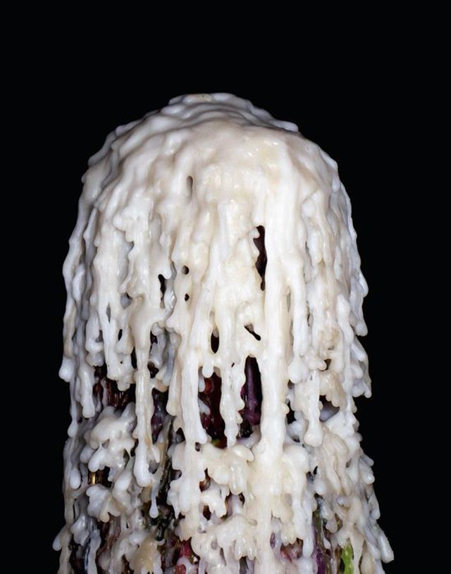 Heute ist die Kerze ein Wohnaccessoire, zuständig für jene Atmosphäre der Behaglichkeit, die wir für Romantik halten (dabei waren die echten Romantiker eher lichtscheue Typen). Noch zu Zeiten Goethes war die sauber brennende Bienenwachskerze eine Luxusobjekt, von dem die einfachen Leute nur träumen konnten – sie stellten ihre qualmenden Kerzen aus Rindernierenfett und Hammeltalg her; und so rochen sie dann auch. All das sollte man im Hinterkopf haben, wenn man die Fotoserie Wachs des Künstlers Martin Fengel betrachtet, der einen frischen Blick auf die längst vergangene Mode der Tropfkerzen wirft. Wir erinnern uns: Tropfkerzen, das waren jene stalagmitengleichen Gebilde, die in den Siebzigerjahren in Aussteiger-WGs, Pizzerien und räucherstäbchenumwölkten Partykellern herumstanden – oder jetzt noch in thailändischen Kifferhütten stehen. Dort hat Fengel eine gesehen und war gebannt von ihrer Strahlkraft: »Sie kam mir wie eingefrorene Zeit vor.«