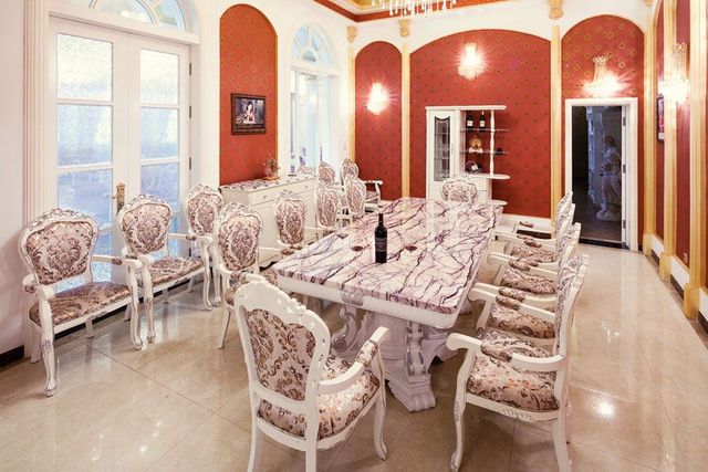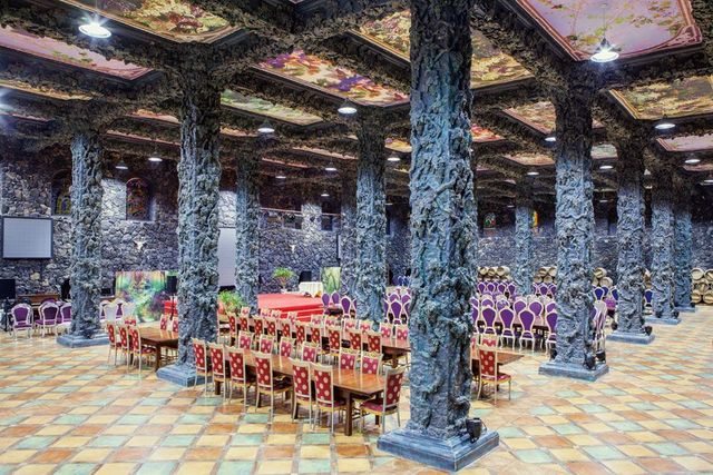Diese Bauten schlugen Di Martino schnell in den Bann. Eines der ersten Schlösser, das der Fotograf aufsuchte, stand nahe der Hafenstadt Penglai, hinter dem Springbrunnen mit Streitwagen. Gefangen im Sog der goldenen Säle, erreichte er das Herz des Gebäudes – einen bonbonbunten Ballsaal, in dem purpurne Sessel prächtige Tafeln säumten, umstellt von Säulen, an denen sich Reben aus Stein emporrankten. »Die erste Reaktion ist: Das ist lächerlich, einfach lächerlich«, sagt Di Martino. »Aber die zweite Reaktion ist: Moment – sich darüber lustig zu machen, ist zu einfach.«