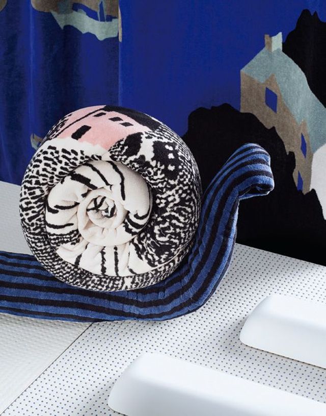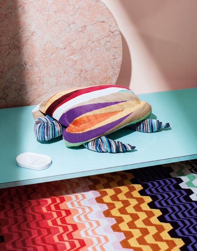 Frottier: Schildkröte aus Handtüchern von Missoni. Seifenschale von Möve, Handtuch auf dem Boden von Missoni.