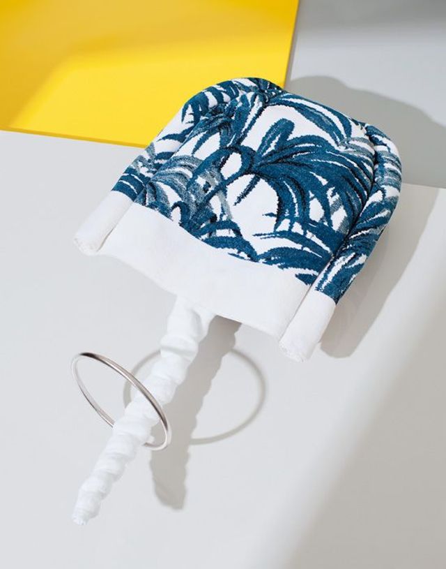 Fliegender Fisch: Rochen aus gemustertem Handtuch von Feiler und weißem Handtuch von Zara. Handtuchhalter von Dornbracht.