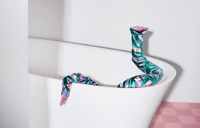 Schief gewickelt: Schlange aus Handtuch von Kenzo für Yves Delorme. Badewanne von Duravit, Bodenfliesen von Golem Design.