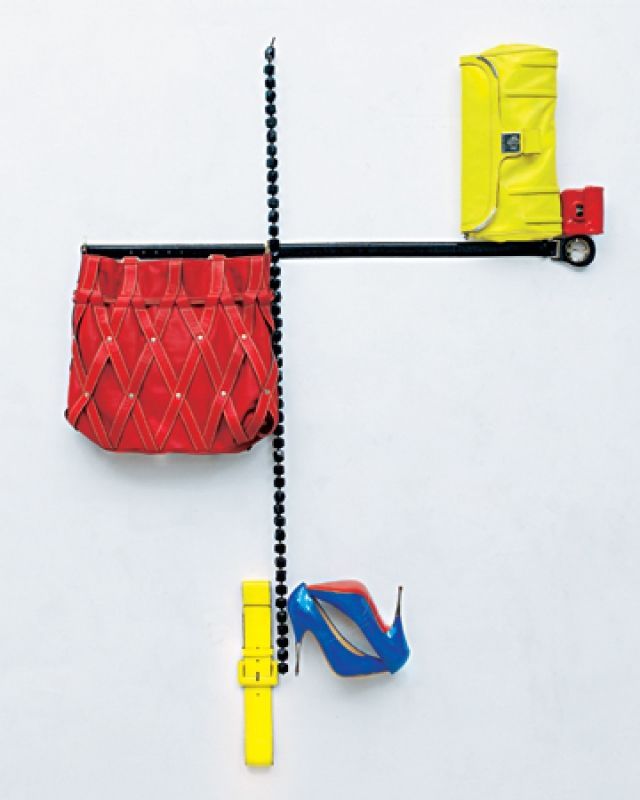 Kette aus Kunstharzwürfeln, von Sonia Rykiel. Handtasche »Corset Oversize« aus gelbem Kalbsleder, von Celine. Knöcheltäschchen aus rotem Lackleder, von Chanel. Schwarzer Lackgürtel von Versace. Beutel »Elsa Twen’y« von Lancel. Breiter Gürtel aus gelbem Lackleder, von Mika Sarolea. High-Heels »Lola Pump« von Christian Louboutin.