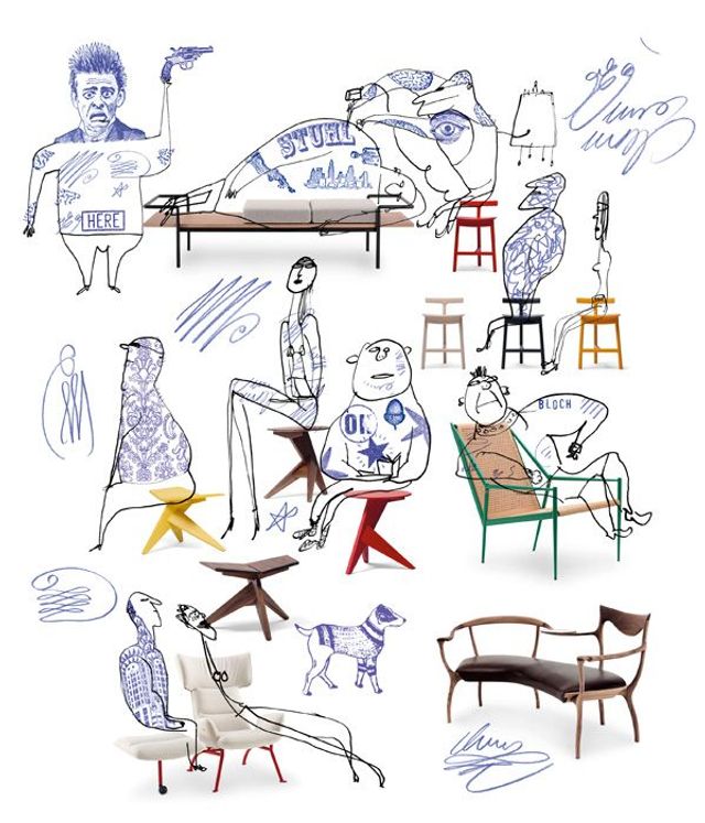 Bunte Truppe Von oben links im Uhrzeigersinn: Bank »T904« von Gastone Rinaldi, Wiederauflage von Poltrona Frau, Barhocker »Radice« von Sam Hecht für Mattiazzi, Sessel »Acciaio« von Max Lipsey für Cappellini, Sofa-Bank »d.r.d.p« von Roberto Lazzeroni für Ceccotti, »@-Chair« von Toshiyuki Kita für Ligne Roset, Hocker »Medici« von Konstantin Grcic für Mattiazzi.