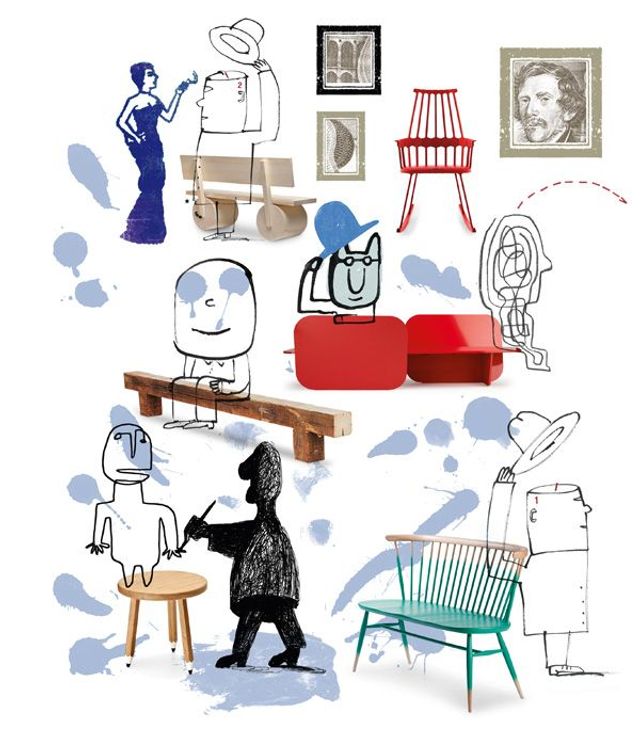 Charakterdarsteller Von links oben im Uhrzeigersinn: Holzbank von Thomas Schnur für Studio 5555, Schaukelstuhl »Comeback« von Patricia Urquiola für Kartell, Bank »Earhart« von Luca Nichetto für La Chance, Bank »Love Seat« von Ercol, Bleistifthocker von Stadthaus München, »Big One Beam Bench« von Piet Hein Eek.