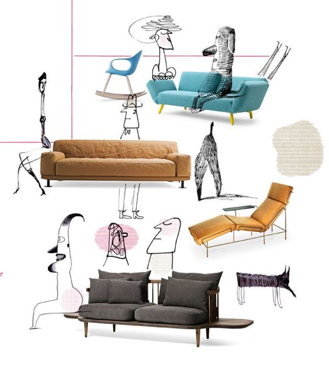 Von oben: Schaukelstuhl »Elephant« von Eva Paster und Michael Geldmacher für Kristalia, Sofa »Dr'op« von Braun und Maniatis für Leolux, Sofa »Newcastle« von Giulio Iacchetti für Meritalia, Chaiselongue »Traffic« von Konstantin Grcic für Magis, Sofa »Fly SC3« von Space Copenhagen für AndTradition.