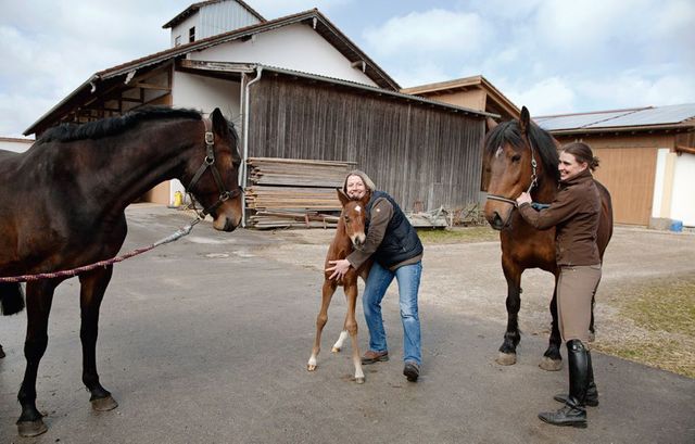 Paula ist ein Pferd mit starkem Mutterinstinkt, ruhigem Gemüt und einem Becken, groß genug für viele Trächtigkeiten: eine vorbildliche Empfängerstute. Sie gebiert problemlos und gibt genug Milch. Schon fünf fremde Araberfohlen hat sie ausgetragen und aufgezogen. Die Rasse tut bei der Leihmutterschaft unter Pferden aber nichts zur Sache: Tierärzte haben schon American Quarter Horses, also Westernpferde, von Haflingern austragen lassen, Zebras von Pferden, Esel von Zebras, Warmblüter von Kaltblütern. So wie auf dem Zuchthof Galneder im oberbayerischen Taufkirchen, 250 Kilometer von Stöckles Gestüt entfernt: Für den Dressurnachwuchs der bayrischen Warmblutstute Piacetta steht dort Kaltblutstute Havanna bereit; ein größeres Becken hat keine andere Pferderasse zu bieten. Vor einer Woche hat sie Piacettas Fohlen geboren. Seine genetische Mutter Piacetta, die in der Box nebenan lebt, interessiert sich nicht für das Fohlen. Dafür aber Havanna, das Kaltblut, das sich nun sechs bis zwölf Monate hingebungsvoll um den Nachwuchs kümmern wird, auch wenn die gemütliche Leihmutter dem Bewegungsdrang des kleinen Dressurfohlens kaum hinterherkommt.