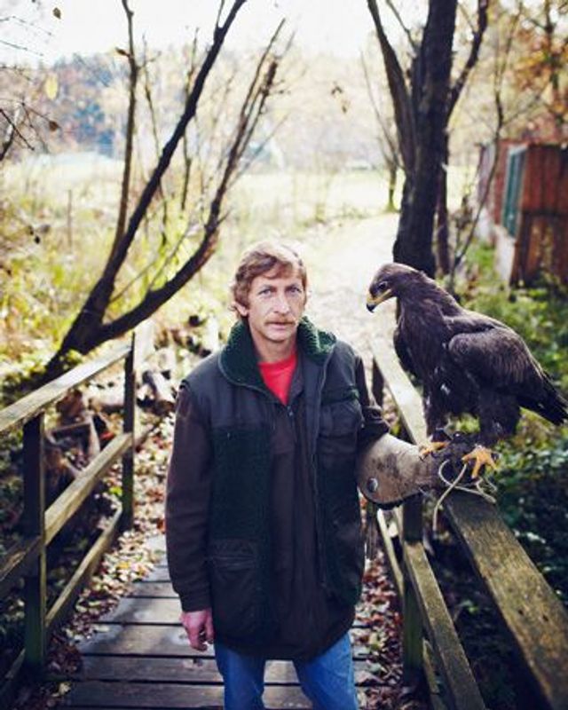»Kaisa wird mit den Jahren immer aggressiver. Sie hackt und beißt, und wenn sie mir auf der Hand sitzt, quetscht sie richtig meinen Arm. Weil Adlerkrallen nun mal nicht steril sind, hat man ruckzuck eine Blutvergiftung. Ich bin der Einzige, der noch mit ihr umgehen kann. Selbst meine Frau traut sich nicht mehr zu ihr. Die Kaisa hat sie mal angefallen und sich in ihrem Arm so festgekrallt, dass meine Frau Stichverletzungen und Prellungen hatte. Christine hat das weggesteckt, sie kennt ja meine Leidenschaft für die Tiere! Ich habe mehrere Greifvögel. Kaisa kam 2003 von einer Wanderfalknerin zu mir. Halb tot. Ich hab sie trotz ihrer chronischen Fußverletzung wieder hinbekommen. Die Falknerin hatte ihr das falsche Futter gegeben. Adler fressen nun mal Hühner, Kaninchen, Mäuse oder Ratten - und kein Putenfleisch vom Metzger.