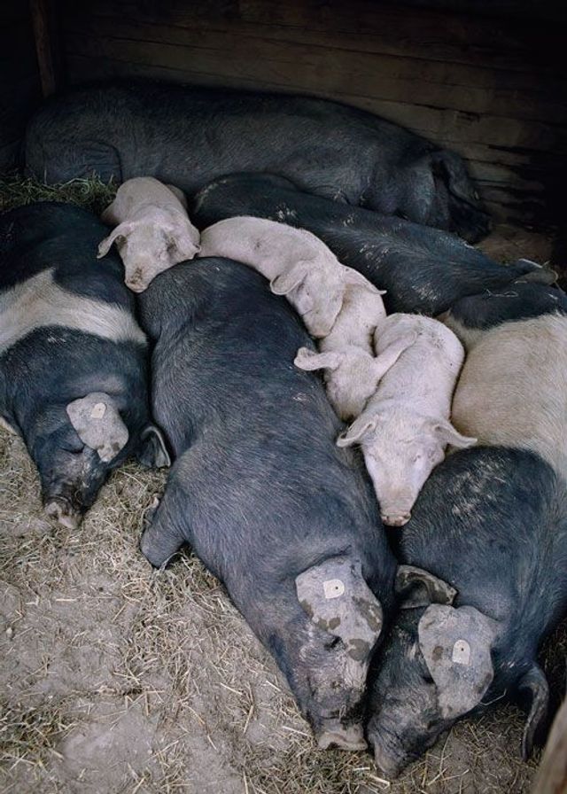 Bis etwa zum Jahr 1850 brauchte ein Schwein drei Jahre, um 50 Kilo zu wiegen. Bis 1900 nur noch zwei Jahre, um auf 70 Kilo zu kommen. Nach 1900 wuchsen Schweine innerhalb eines Jahres auf 100 Kilo. Heute brauchen sie dafür sechseinhalb Monate – natürlich auch, weil sie sich kaum noch bewegen.