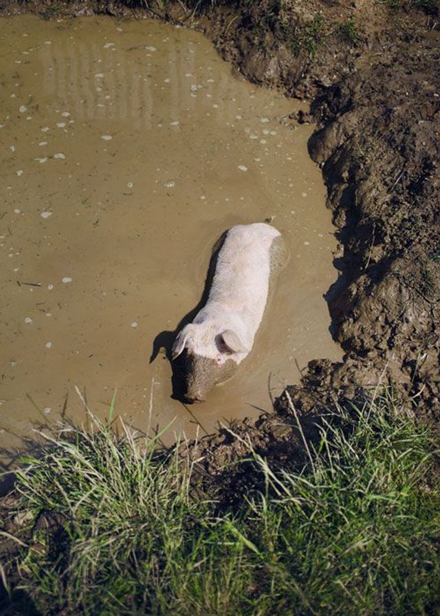 Bei der Schweinezucht geht es um die sogenannten »wertvollen Teilstücke«: Schulter, Rücken, Kotelett, Filet, Schinken. Die Füße sind bei Schweinen nicht wichtig. So kommt es, dass die Rücken lang, die Beine aber kurz gezüchtet werden. Auch unsere vier Mastschweine hoppeln eher über die Wiese, als dass sie gehen. Dann aber entdecken auch sie das Wasser, wälzen sich zum ersten Mal in ihrem Leben im Schlamm und grunzen zufrieden. Schweine seien extrem kreislauflabil, erklärt Sambraus, empfindlich für hohe Temperaturen, und Schweißdrüsen hätten sie keine. Deswegen regulierten sie ihren Wärmehaushalt durch Suhlen, immer darauf bedacht, die empfindlichen Ohren nicht unterzutauchen. »Eine bemerkenswerte Form der Wärmeregulierung im Tierreich«, sagt Sambraus. »Dazu stabilisiert das ständige Wühlen ihren Kreislauf, ein wirklich kluges System.« In der Intensivhaltung aber kommt das Suhlen nicht vor, auch kein Wühlen.