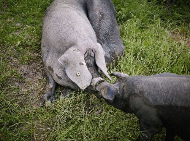 Die Sonne scheint, die Schweine liegen im Schlamm, alles wirkt friedlich. Nur die Rinder schreien auf der Weide nebenan. »Wir mussten ihnen die weiblichen Kälbchen wegnehmen«, erklärt Zahn. »Weil sie mit dem Stier leben, würden wir ein Inzuchtproblem kriegen.« Drei bis vier Tage trauern die Kühe um ihre Kälber: Es sind lange, klagende, verzweifelte Laute.