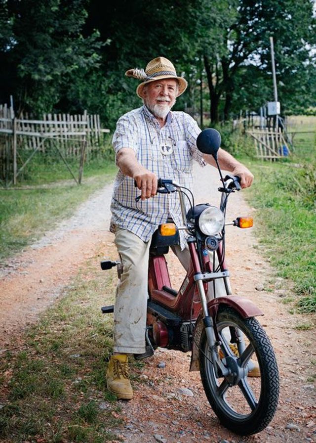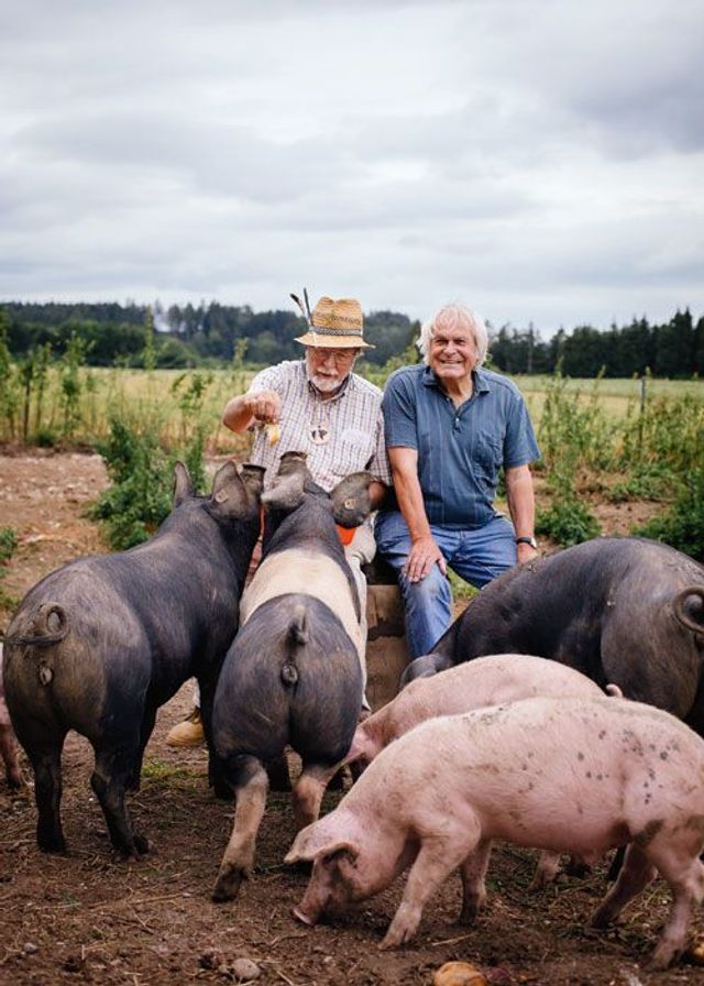 Zahn hat vor seiner Rente als Arzt die Straubinger Frauenklinik geleitet, in seiner Zeit kamen dort etwa 25 000 Kinder zur Welt. Auf dem Hof lebt er mit seiner Frau Brigitte, 65, und mit Rindern, Hühnern, Pferden, Ziegen, Schafen, Schweinen und den Spitzen – auch sie sind vom Aussterben bedroht. Zahns Rinder der alten Rasse »Murnauer Werdenfelser« leben auf der Weide mit ihrem Stier, der groß und schwer wie ein Panzer ist. Ihre Augen strahlen schwarz aus dem cappuccinofarbenen Fell, sie sehen aus wie geschminkt. Zahns Schweine, »Schwäbisch-Hällische« Landschweine, wurden früher wegen ihrer schwarzen Musterungen auch »Mohrenköpfe« genannt. Sie rennen vergnügt über ein riesiges Gelände mit einem kleinen Wasserloch zum Baden, einer Hütte mit Stroh zum Schlafen, viel Weide zum Grasen. Von den Schwäbisch-Hällischen gab es vor dreißig Jahren nur noch sieben Tiere. Dank engagierter Landwirte ist die Rasse nicht ausgestorben. Sie war nach dem Zweiten Weltkrieg aus der Mode gekommen, weil sie zu viel Fett ansetzt. Fett ist nicht mehr im Sinne des Verbrauchers. Deswegen kreuzt man heute zu den Schwäbisch-Hällischen die alten Rassen Duroc oder Piétrain: um Schlachtschweine mit weniger Fett am Bauch zu bekommen. Zahn nennt alle seine Schweine »Dicki«, so wie er alle seine Thüringer Waldziegen »Ricola«, alle seine Bergschafe »Huberta« und alle seine Rinder »Romy« nennt.