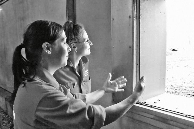 Im Moment gibt es elf Gehege in Gänserndorf. In einem tummeln sich sogar neun Schimpansen, in fünf anderen sitzen immer noch Tiere allein, wenn auch mit eigenem Auslauf ins Freie. Daran wird sich wohl auch nichts mehr ändern, der Kontakt mit anderen Affen »stresst sie einfach zu sehr«, erklärt Renate Foidl. Sie reagieren sehr wohl auf menschlichen Zuspruch, aber auch das sei eine zweischneidige Angelegenheit: »Wenn du dem Peter heute eine Stunde gibst und morgen nicht mehr, kommt er damit nicht klar. Er verletzt sich dann selbst, beißt sich oder zerkratzt sich das Gesicht.« Auch Clyde buhlt fortwährend um Aufmerksamkeit. Als Foidl an seinem Gehege vorbeikommt, baut er sich sogleich vor ihr auf, beginnt von einem Fuß auf den anderen zu wippen, klopft sich auf die Brust und springt dann mit voller Wucht gegen die Scheibe. Foidl drängt zum Weitergehen, »sonst macht er ewig so weiter«.