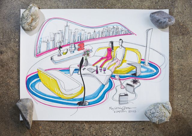 4. Zeichnung von Karim Rashid: Rashid hat für uns sein »postpandemisches Traum-Interieur« gezeichnet, so nennt er das. Er glaubt, dass auch nach Corona das Zuhause als Ort eine neue Bedeutung haben wird: »Während der Pandemie zu Hause zu bleiben war für viele ein Moment der Entschleunigung und der Besinnung auf die eigene Existenz, auf die eigene Bedeutung und den eigenen Beitrag zur Welt. In unseren Wohnungen sollten wir die Technik nutzen, um eine Umgebung zu schaffen, in der wir uns verjüngen, zurückziehen und entspannen können. Wo, wenn nicht dort, kann man die Welt mal hinter sich lassen, seine Sinne neu beleben und wieder in Kontakt mit dem eigenen Körper (unserem Tempel in diesem Leben) kommen. Die Welt ist so überladen mit Informationen, und wir arbeiten mehr denn je. Unser Heim und die Gegenstände, mit denen wir uns umgeben, bleiben unser letzter Rückzugsort.«