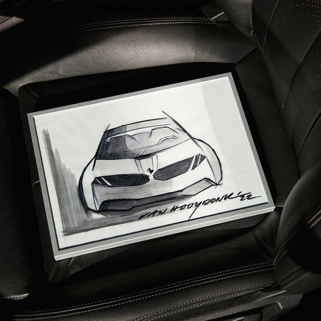 7. Zeichnung von Adrian van Hooydonk: Die gerahmte Originalzeichnung von van Hooydonk zeigt einen »BMW iVision Circular«, eine Zukunftstudie für ein elektrisches Auto, das zu 100 Prozent aus recycelten Materialien bestehen soll und 2040 auf den Markt kommen könnte. Die Hoffnung ist, dass die Industrie bis dahin zirkulär funktioniert, also fast ohne Verbrauch neuer Ressourcen auskommt. Der kompakte und komplett vernetzte Wagen soll laut BMW Nachhaltigkeit mit Luxus versöhnen. Der nieren-förmige Kühlergrill ist dann zum Beispiel nur noch eine Grafik auf einem offen bespielbaren Frontdisplay. Für BMW-affine Besitzer dieser Skizze wird es spannend zusehen, inwiefern Vision und Wirklichkeit in 17 Jahren tatsächlich übereinstimmen. Möglich, dass diese Zeichnung dann unter Sammlern so viel Wert ist wie das Serienmodell des »iVision Circular«.