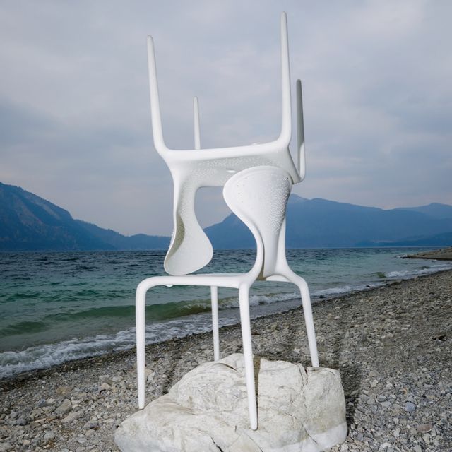 5. Stühle von Ross Lovegrove: Für unsere Auktion hat sich Lovegrove in die Tiefen seines Londoner Privatarchivs begeben und stellt zwei Vorstudien seines Stuhls »Supernatural« zur Verfügung, den er 2005 für den italienischen Hersteller Moroso entworfen hat. »Der Stuhl aus Kunststoff ist voll funktionstüchtig und in Museumsqualität«, erklärt Lovegrove, »er weist Gebrauchsspuren auf, denn er war viele Jahre Teil des Studio-Mobiliars. Mein Sohn Roman und ich standen vor der Aufgabe, die organische Form des Stuhls weiter aufzulockern. Also haben wir mit der Bohrmaschine herumexperimentiert und viele kleine Löcher in Sitz und Lehne gebohrt.« Die Löcher im fertigen Industrieprodukt wurden dann zwar viel größer, doch auf der ganzen Welt dürfte es nur eine Handvoll »Supernaturals« geben, bei denen der Meister selbst Hand angelegt hat. »Ich mochte es, wenn die Sonne auf ihn schien und das Licht ein schönes Muster auf den Boden zauberte. Einmal war Marcel Wanders bei mir zu Besuch und zeigte großes Interesse an dem Stuhl. Das empfand ich als schönes Kompliment.«